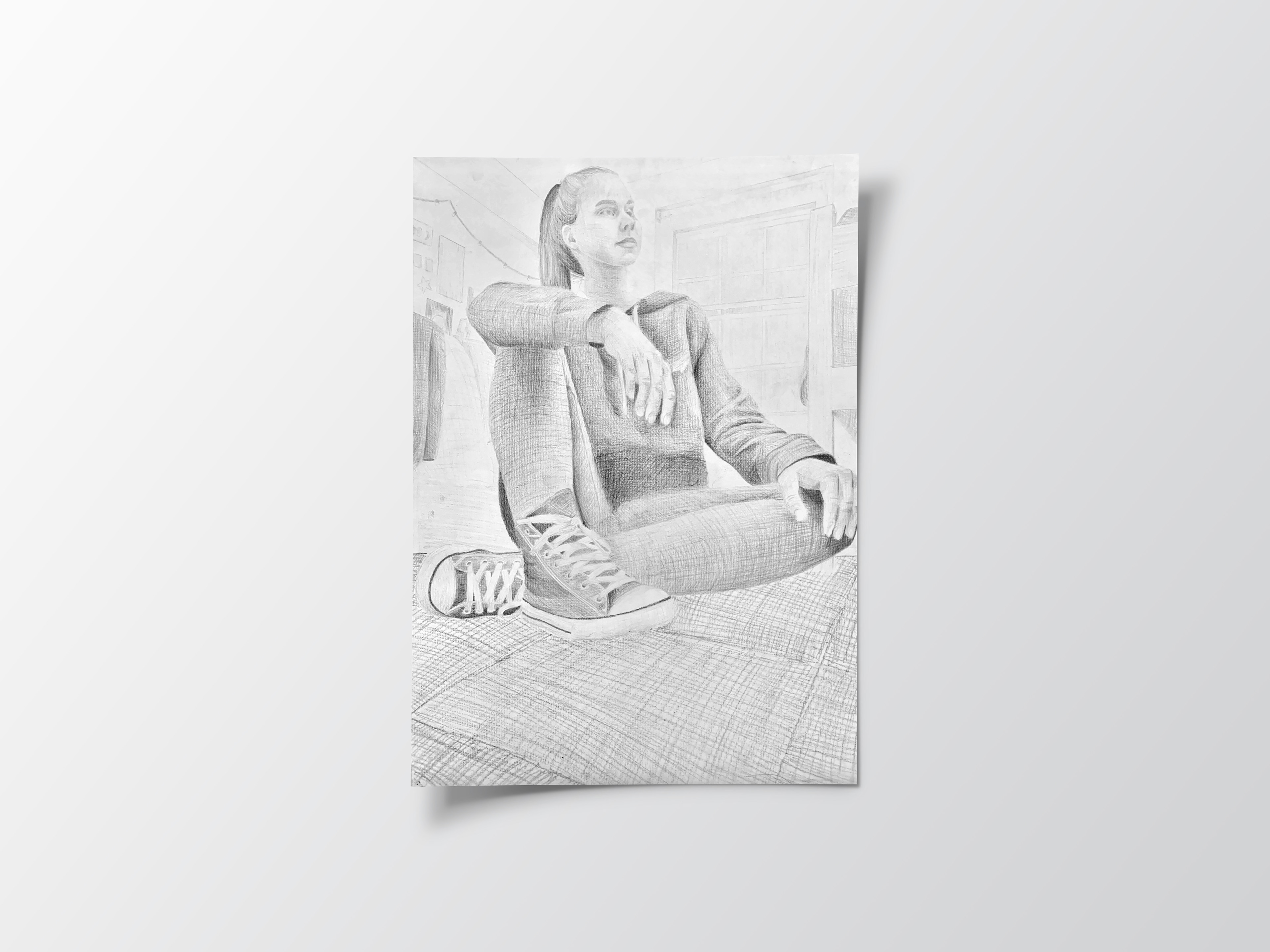 When approaching subject matter and background, I assessed what I wanted to get out of drawing this self portrait. An artistic goal was to create an interesting composition by using an angle that I have not drawn before. My other goal was self awareness, to understand how I was living in that moment and capture it on canvas. I chose what is seen in the final for this reason, for I am in my element with my favorite sweatshirt and comfy shoes on, and I am sitting in my room. This is where I like to do a lot of my creative work for school, because I have really made my space my own.